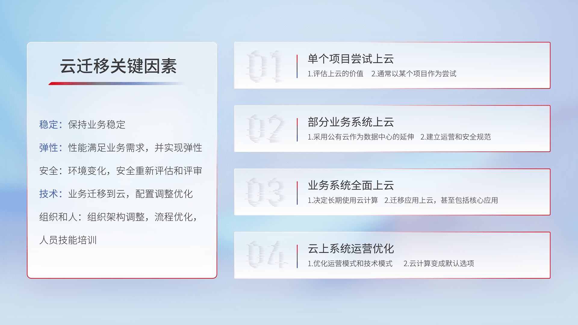 结合实际业务,,,从规划设计、、云平台选型、、云原生改造、、、数据迁移、、集成交付,,迁移全过程为客户识别最佳上云路径,,做好风险识别管理,,设计网络架构、、、、身份权限、、、安全审计合规、、操作审计、、、、日志审计、、监控告警策略、、、、多站点容灾设计等,,,,对云上基础设施进行整体规划,,,提升IT治理水平,,,,以满足弹性、、、高可用、、高性能的需求。。